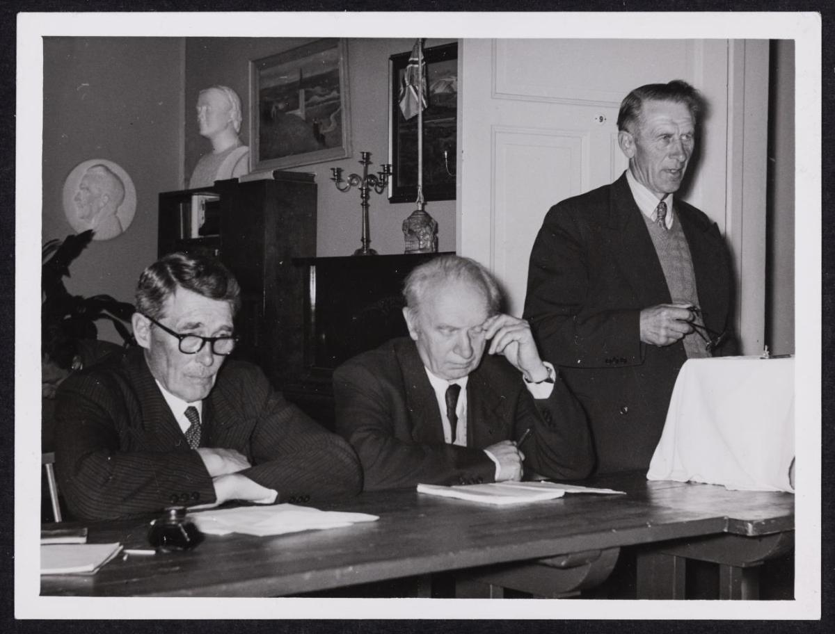 flytur ræðu. Fyrir miðju borðinu eru fundarstjórarnir, Jón alþingismaður