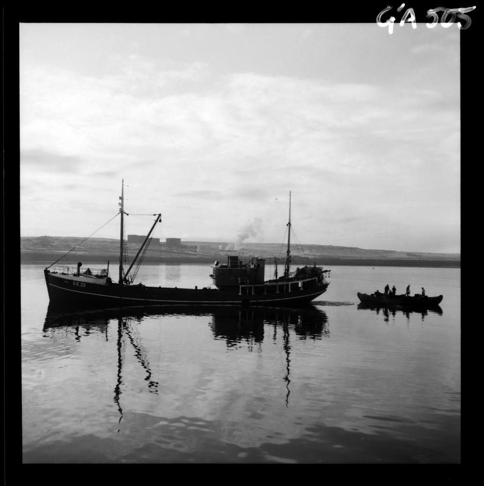 Fiskiskipið Edda GK 25 á Hafnarfirði. Aftan við það tveir nótabátar með mannskap í. Hvaleyrarholt í baksýn en þar sjást nokkrir olíutankar og fáein hús. Syðri hafnargarðurinn t.h.