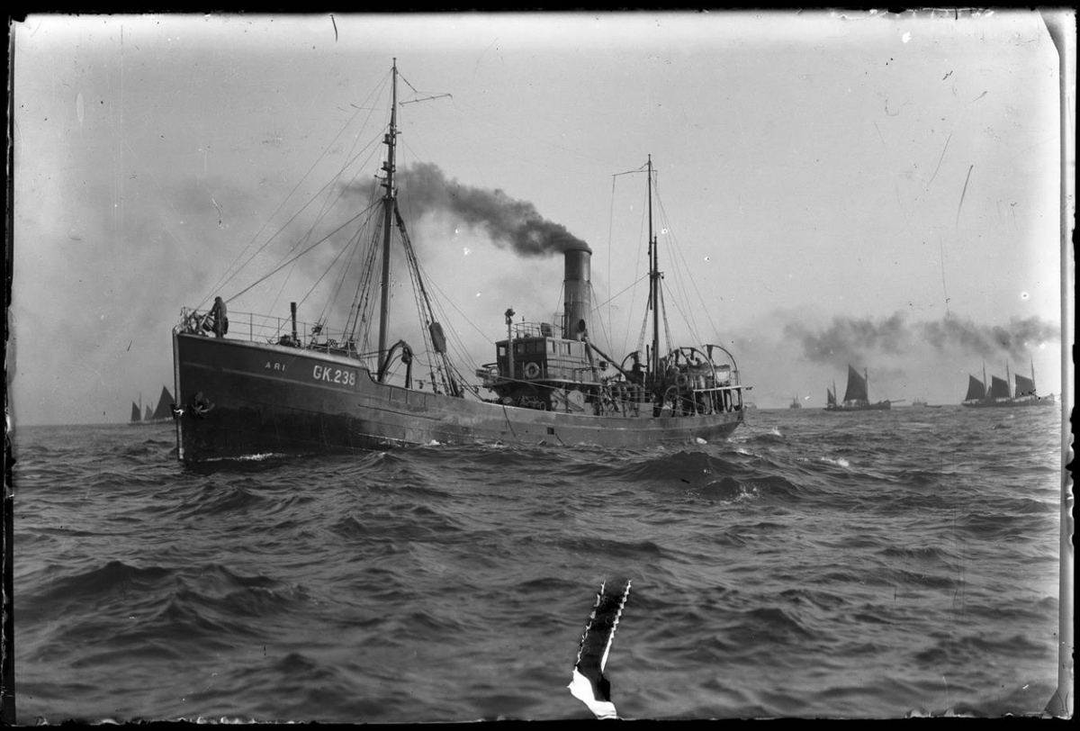 Togarinn Ari GK 238 að veiðum. Fiskiskútur í bakgrunni, en enn fjær (t.h.) fáeinir togarar.