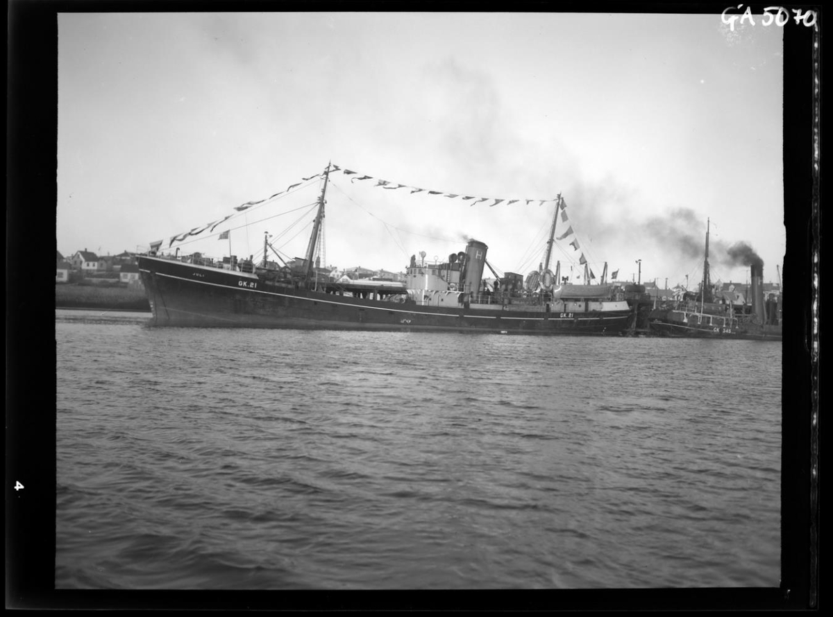 Kópía sýnir ekki allt negatív. Myndin tekin er Júlí kom nýr í nóv. 1947, sbr. 5069. Togarinn til hægri er Júní GK 345. Sbr. Jón Bjönsson, Íslensk skip 1, (Rv. 1990), bls.206- 207.