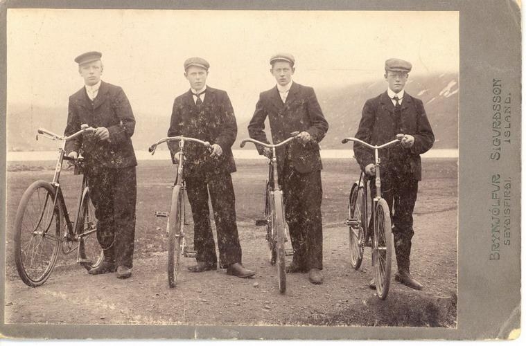 Í forgrunni standa fjórir ungir alvörugefnir karlmenn í jakkafötum og með derhúfur á höfði, hallir með reiðhjól sér við hlið. Þeir standa samhliða á malarvegslóða, í baksýn sér í fjörð og fjall.