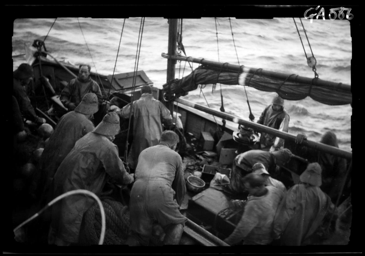 Sjóklæddir menn og einn á samfestingi standa við borðstokk skips. Við hlið þess er minna skip og nokkrir sjóklæddir menn um borð.
