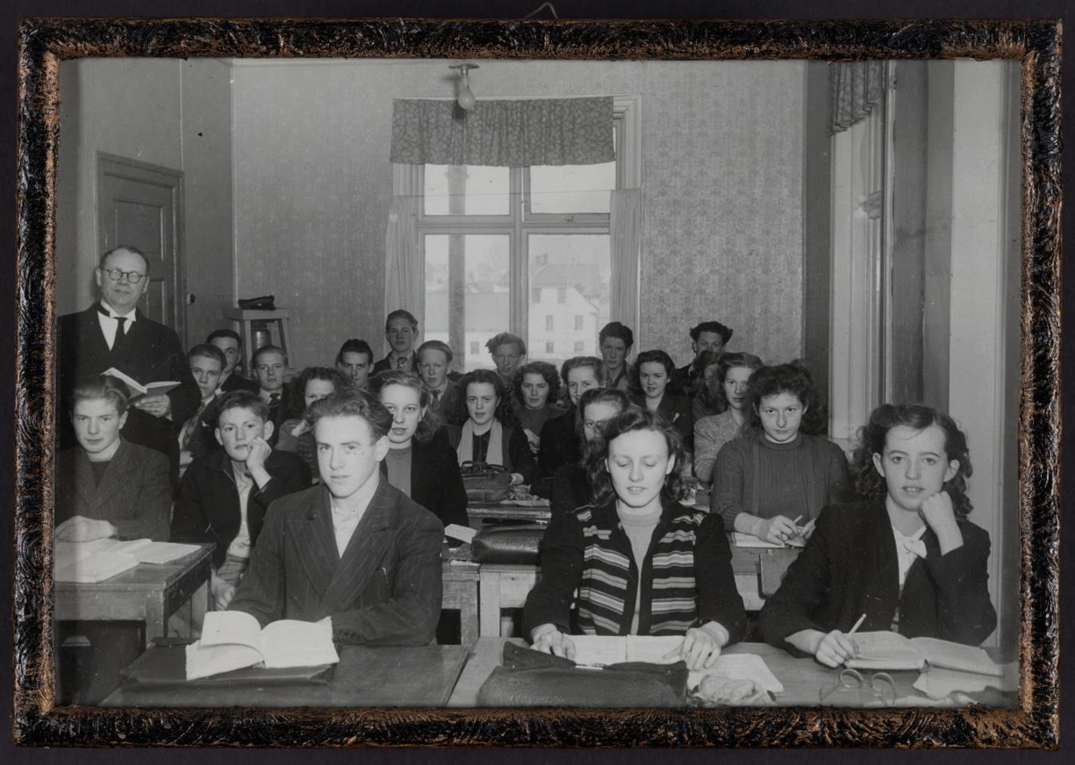 Horft yfir skólabekk í framhaldsskóla, nemendurnir, piltar og stúlkur, sitja með opnar bækur á borðunum. Kennarinn, karlmaður með gleraugu, stendur við vegg yst t.v. með bók í hönd. Út um glugga á vegg í bakgrunni, sér yfir nokkra byggð.