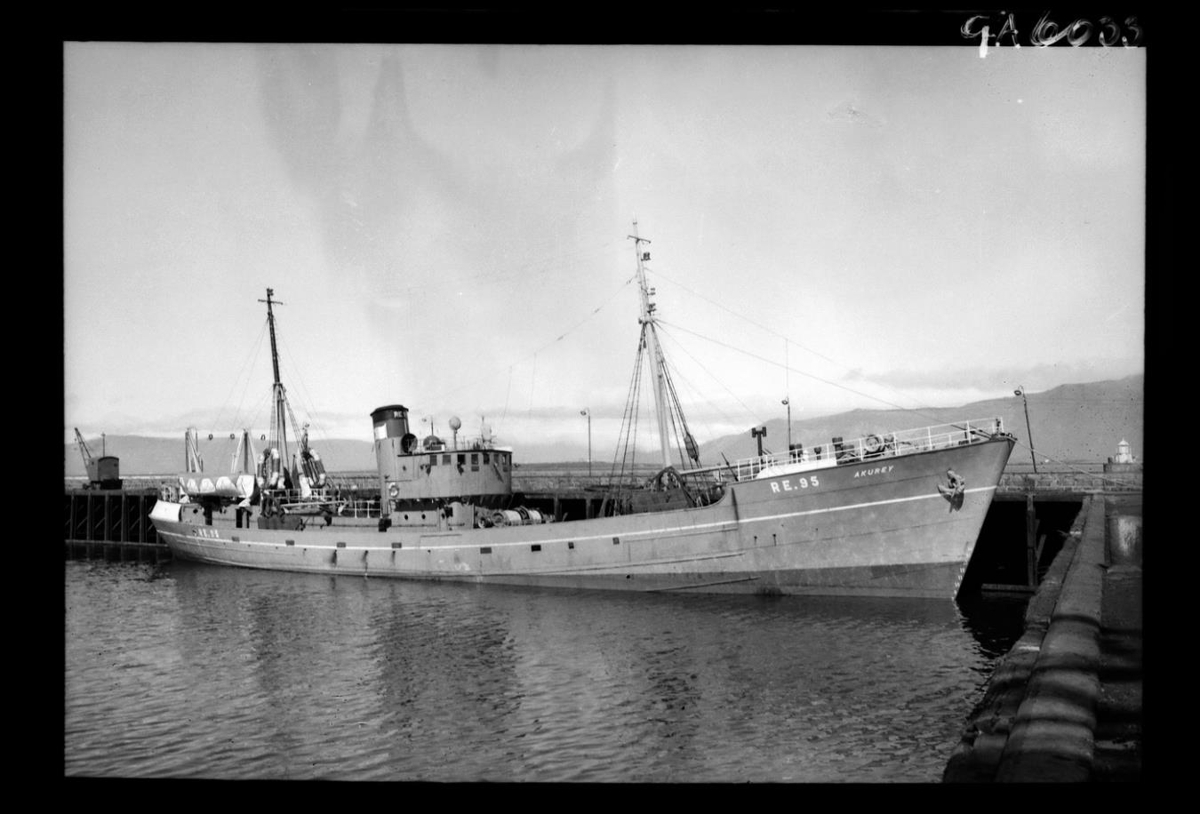 Togarinn AKUREY RE 95 liggur við bryggju við Faxagarð í Reykjavík. Lengst t.v. á bryggjunni má sjá krana. Akrafjall og Esja í bakgrunni.