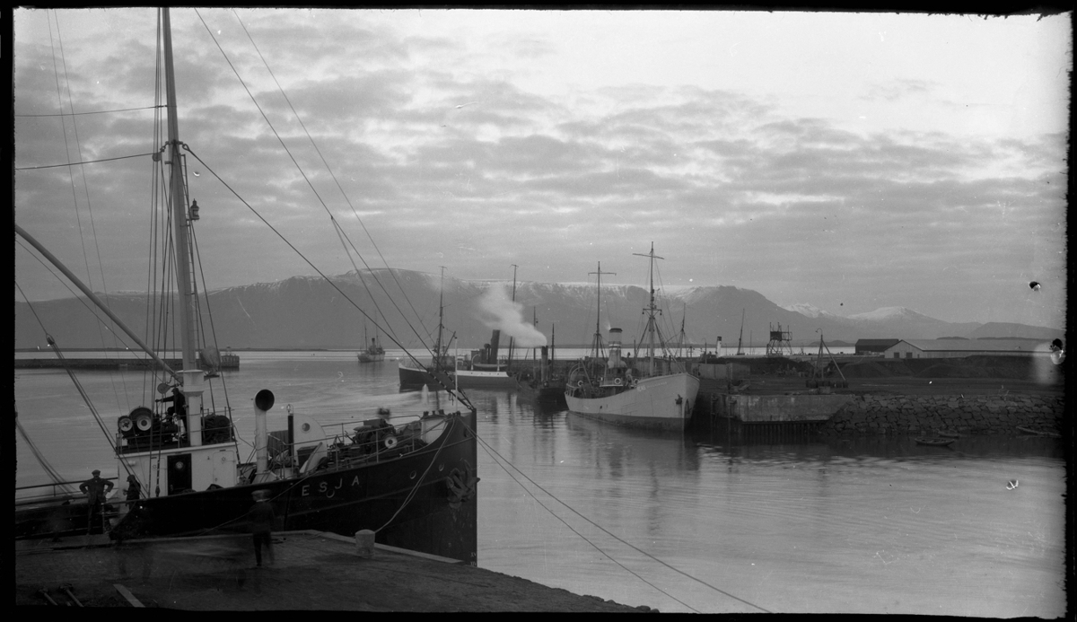 Frá Reykjavíkurhöfn. Esja og RE Skallagrímur, Geir björgunarskip, meðal skipa í höfninni. Tekið 1923-38.