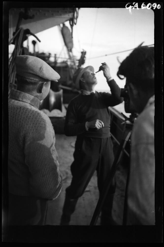 Myndin er tekin um borð í togara og á henni sjást tveir menn að hluta og einn til fulls. Sá síðasttaldi stendur fyrir miðju, klæddur dökkri peysu og buxum, hallar sér aftur á bak og ber tóbakspontu að nösum. Maður t.v. sést skáhallt aftan frá og er á peysu og með enska húfu (sixpensara). Maður til hægri stendur aftan við kvikmyndatökuvél á þrífæti og er berhöfðaður. Sést aftan frá og að mjög litlum hluta. Í baksýn borðstokkur, hvalbakur og spilkoppur, en þó ógreinilegt fremur.