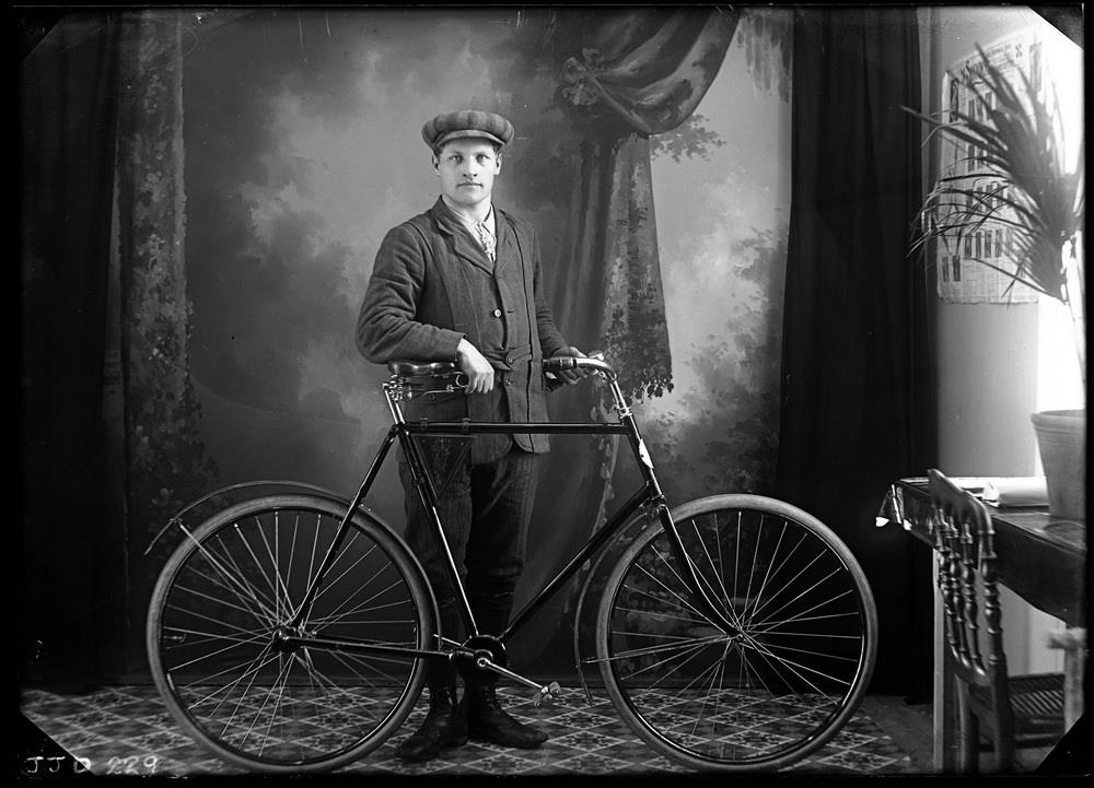 Maður með reiðhjól, gæti verið Guðmundur Hafdal Sigurjónsson (á stofu).