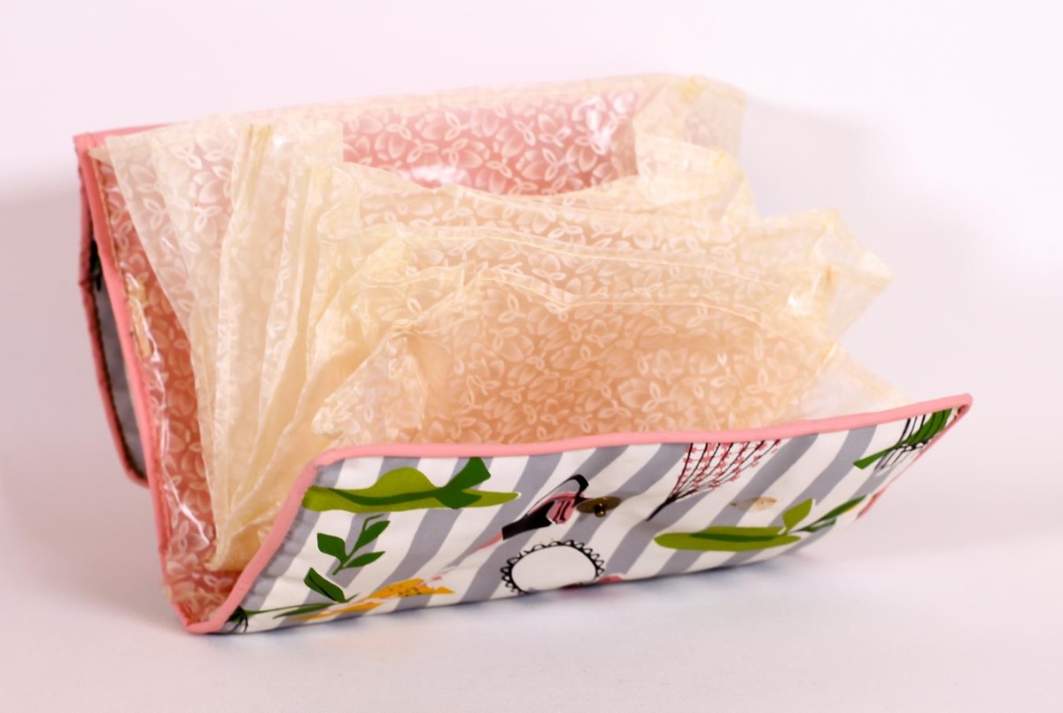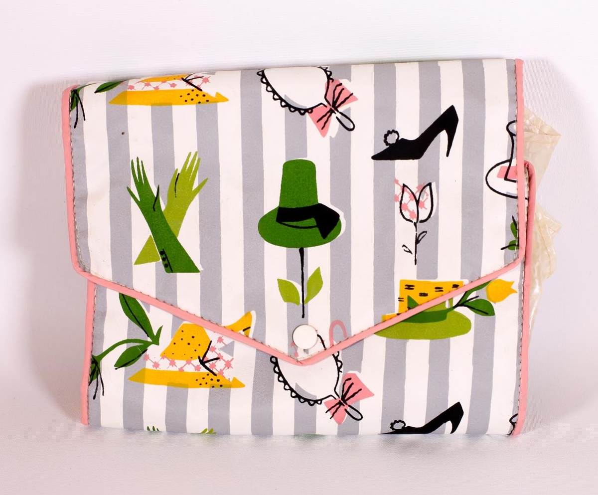 Plast snyrtiveski, röndótt grátt og hvítt með mynd af blómum, skóm og höttum.
