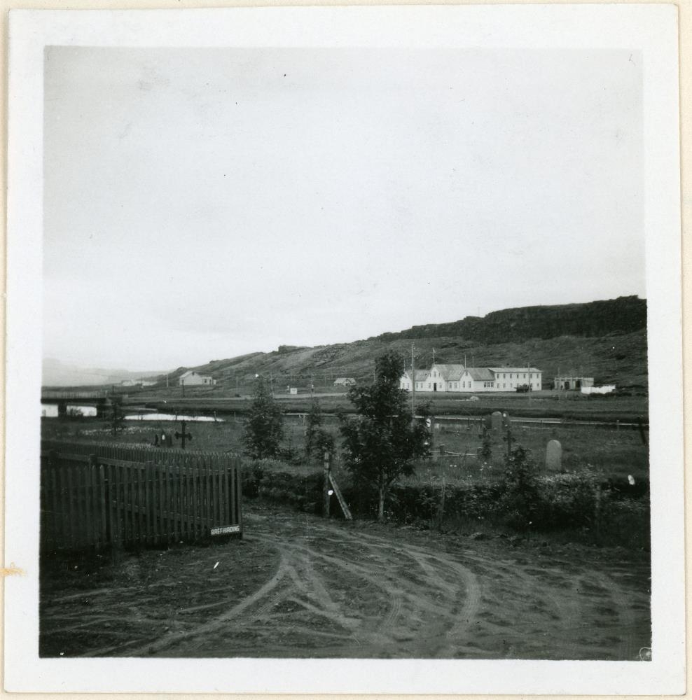 Í baksýn er Hótel Valhöll t.h. og fjær t.v. sést konungsbústaðurinn sem seinna varð ráðherrabústaður. Öxarárbrúin yst t.v.