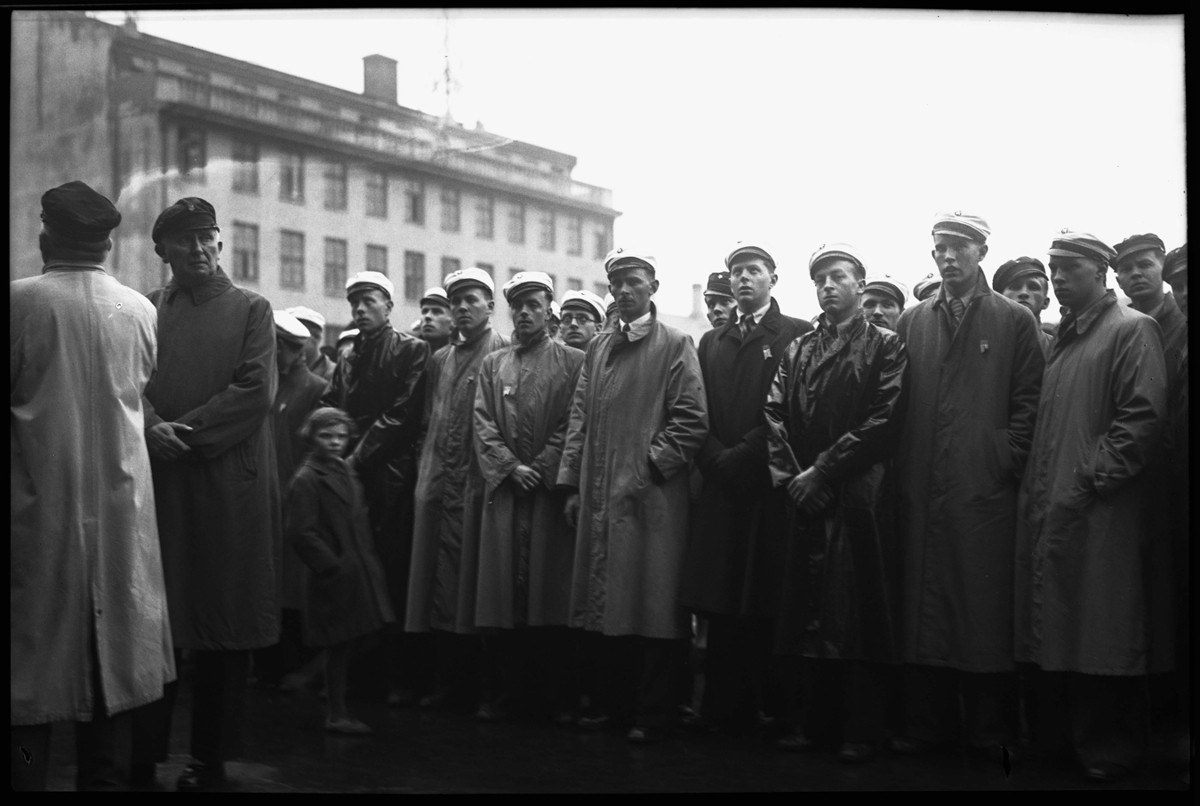 Landsmót stúdenta 1938. Stúdentar framan við Alþingishúsið. Þar má þekkja: Sigurður Eggerz ráðherra, Einar Ingimundarson bæjarfógeti, Helgi Þorláksson skólastjóri, Tryggvi Jóhannesson verkfr., Kristján Bjarnason prestur, Jónas Haralz hagfr., Skúli Thoroddsen læknir, Jón G. Tómasson verkfræðing og Guðmundur Björnsson læknir.