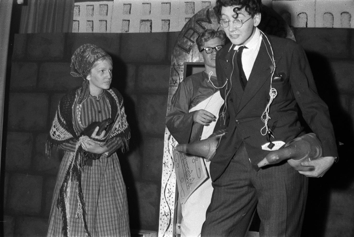 Gagnfræðaskóli Vesturbæjar. Reykjavík. Leikendur á sviði við gullna hliðið sem er með áletruninni LANDSPRÓF. Í baksýn tjald með mynd Menntaskólans Í Reykjavík. Árshátíð Gagnfræðaskóla Vesturbæjar. Leikritið Sálin hans Denna eftir Helga Skúla Kjartansson. Helgi Skúli Kjartansson fyrir miðju. Birt í Lesbók Morgunblaðsins 14.3. 1965. Filma 35 mm.