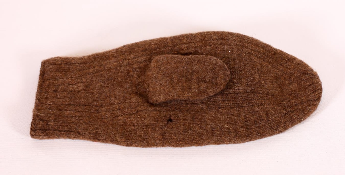 Tvíþumla vettlingur, ljósbrún með rauðum upphafstöfum A-J.