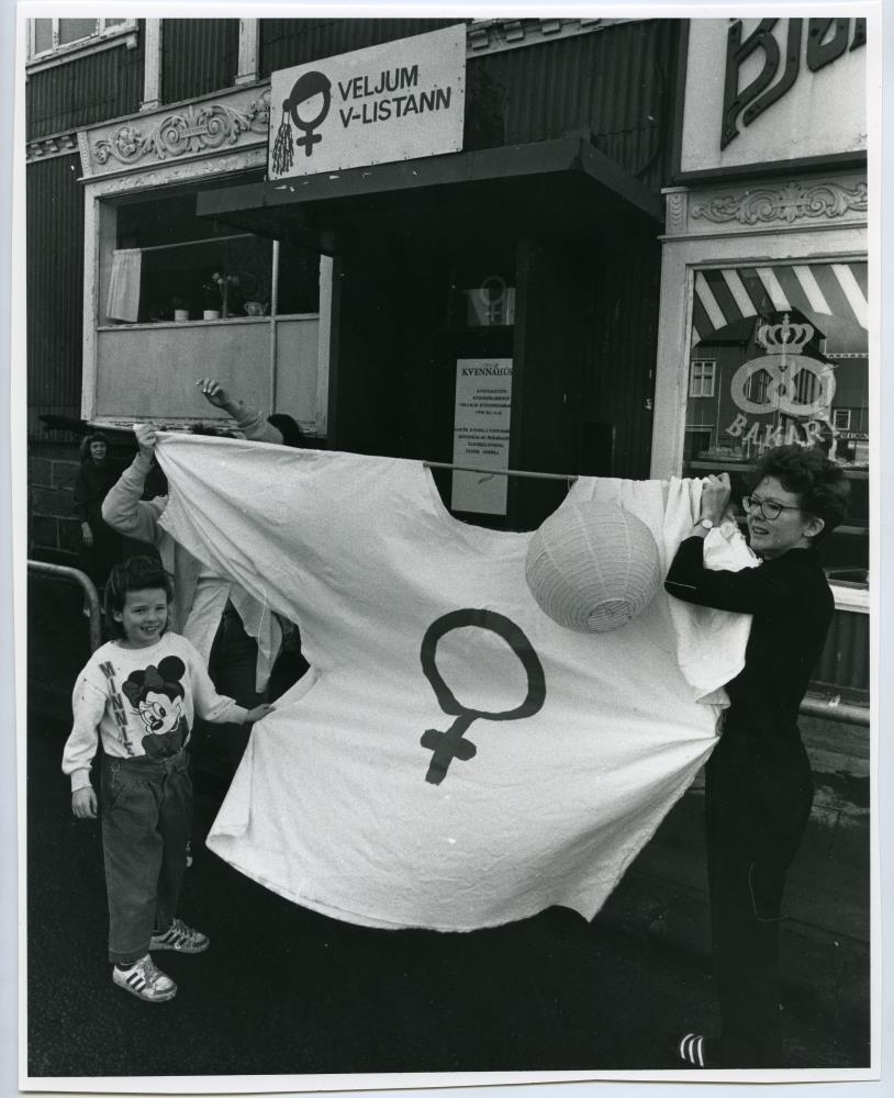 með ámálað kvennamerki, hringur með kross niðurúr. Tvær konur standa beggja