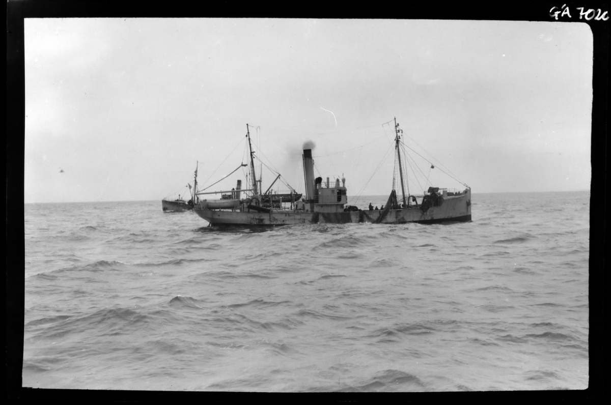 Togari, með fallbyssu á hvalbak, að togveiðum. Annar togari á bak við á móts við skut.