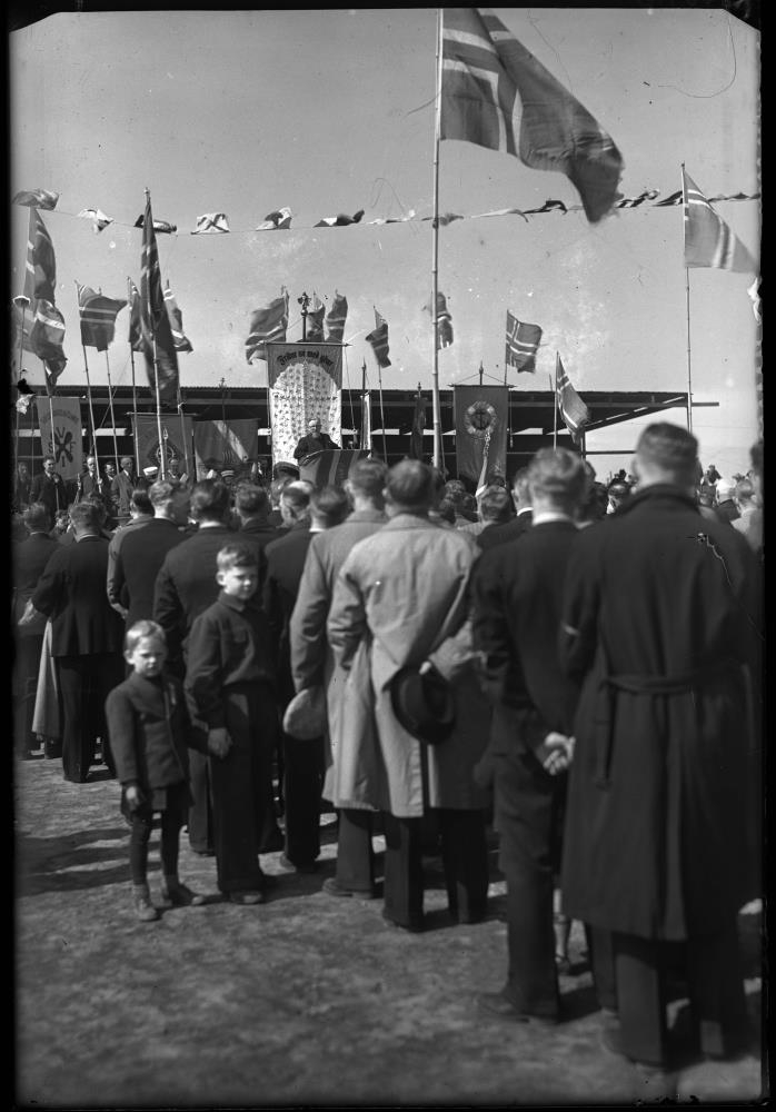 Í ræðustól: Guðmundur G. Hagalín rithöfundur (HJJ). Guðmundur Hagalín talaði sem fulltrúi sjómanna (Gjörðabók Sjómannadagsins 1938-1978,bls. 51. Bókin er í vörslu Sjómannadagsráðs). Á bak við ræðumann stjörnufáninn svokallaði, sbr. nr. 8003. Fáni Skipstjóra- og stýrimannafél. Öldunnar t.v. en til hægri fáni Sjómannafélags Hafnarfjarðar.
