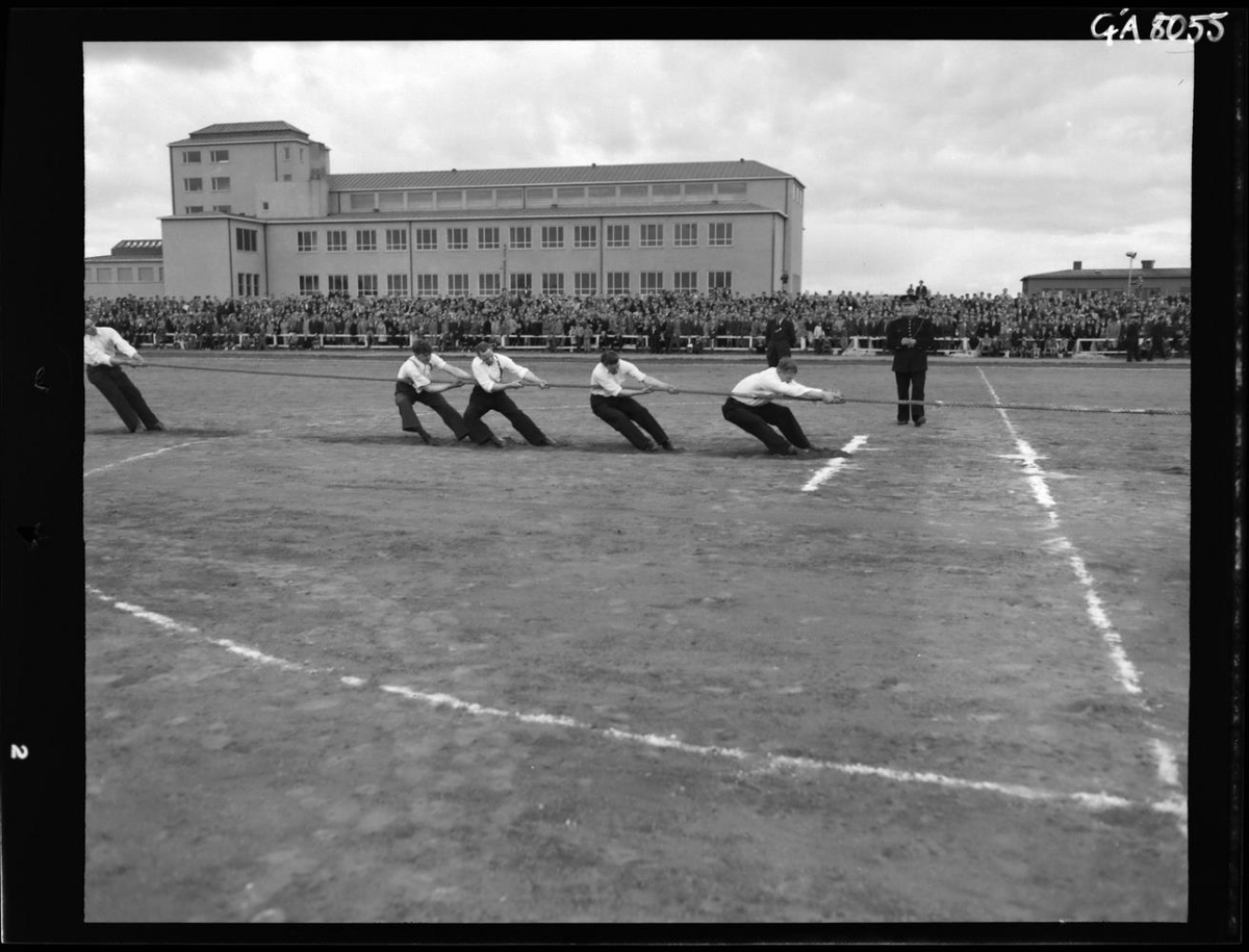 Frá reiptogi á sjómannadaginn í Reykjavík að öllum líkindum á tímabilinu 1948-1952. Íþróttavöllurinn á Melunum.