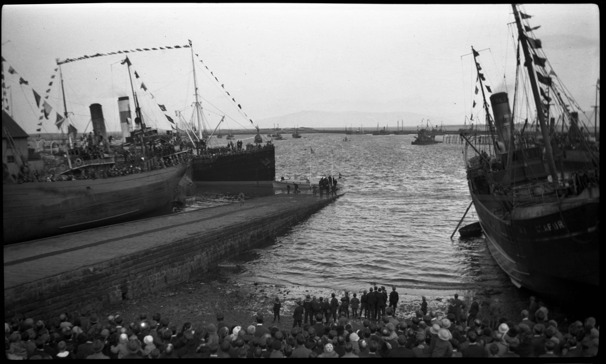 Konungskoma 1926. Frá Reykjavíkurhöfn. Mannfjöldi bíður konungs.