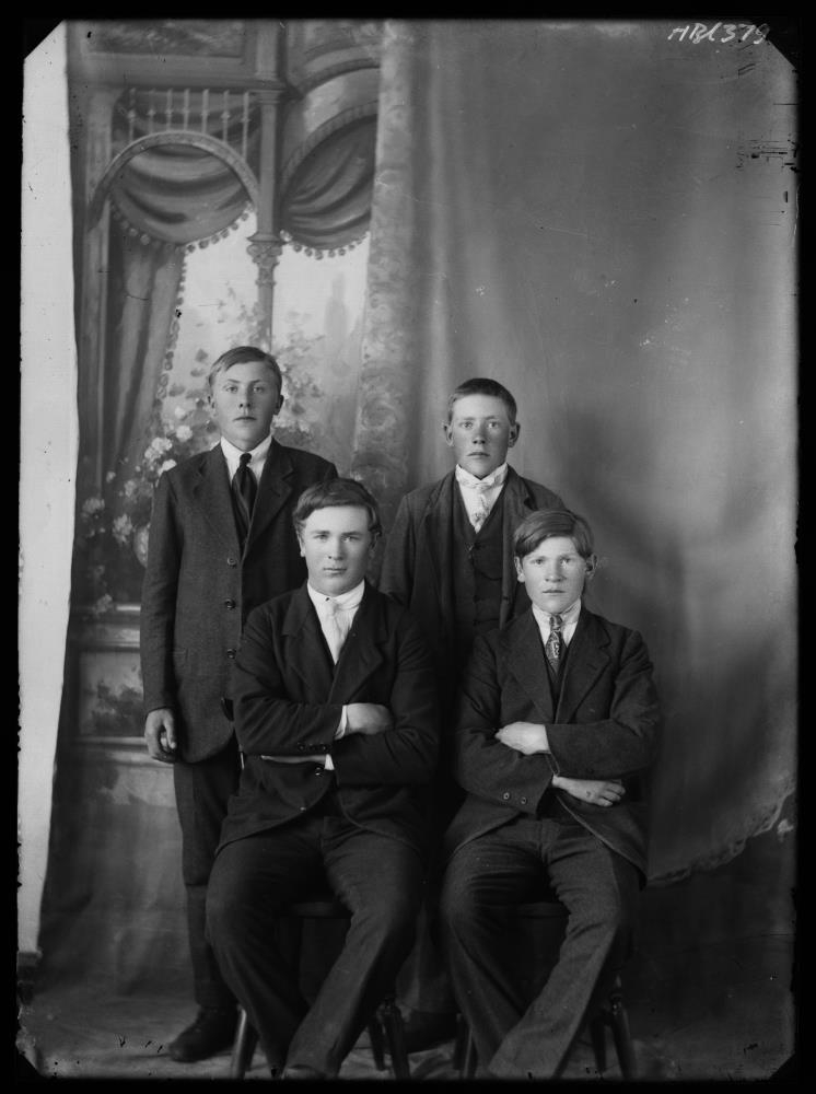 Fjórir ungmennafélagar í Sandvíkurhreppi 1918. Framar eru bræðurnir Lýður Guðmundsson og Þorvarður Guðmundsson Litlu-Sandvík. Aftar Guðmundur Hannesson Litlu-Sandvík og Ari Páll Hannesson Stóru-Sandvík.