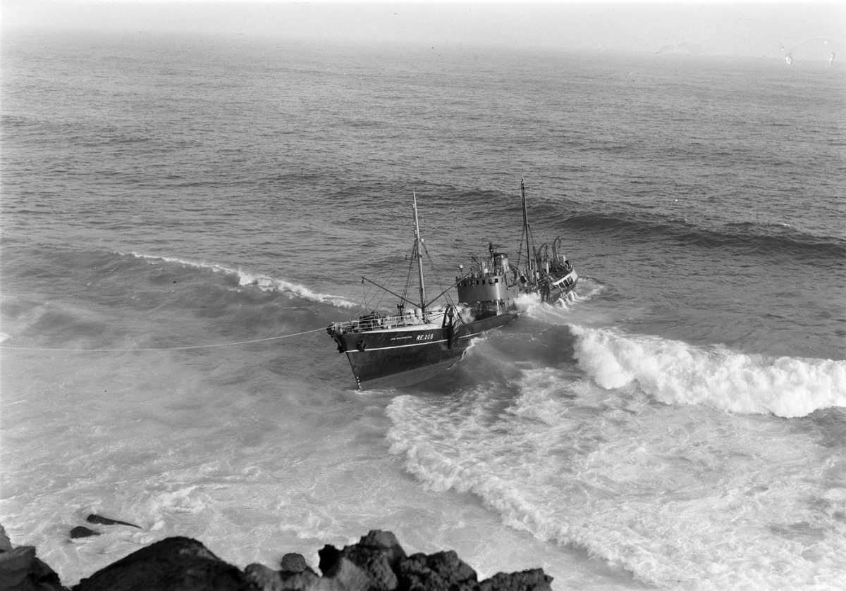 Strand Vb. Jón Baldvinssonar RE 208 við Hrafnkelsstaðaberg á Reykjanesi 31. mars árið 1955.