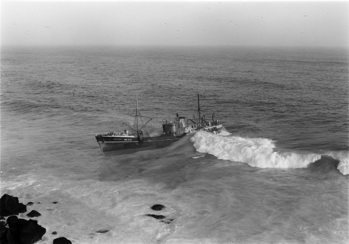 Strand Vb. Jón Baldvinssonar RE 208 við Hrafnkelsstaðaberg á Reykjanesi 31. mars árið 1955.