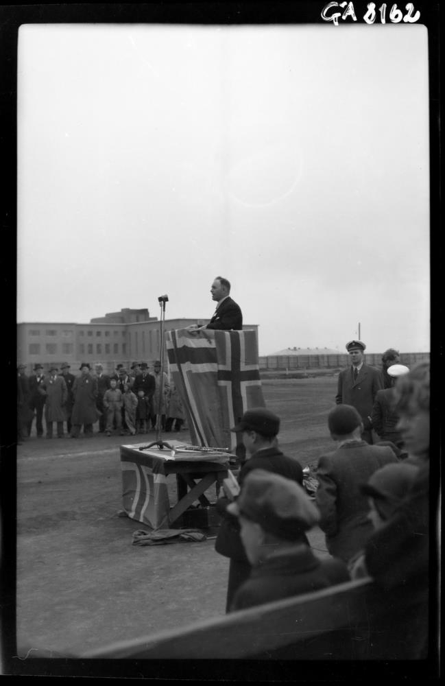 Frá minningar- og útisamkomu á Íþróttavellinum (á Melunum) á sjómannadaginn 6. júní 1943. Athöfnin hófst kl. 14.00. Í ræðstól er Henrý Hálfdánarson, loftskeytamaður og skrifstofustjóri Slysavarnarfélags Íslands. Hér talar hann sem fulltrúi sjómanna. ( Skv. gjörðabók Sjómannadagsins 1937-1978,bls. 73).