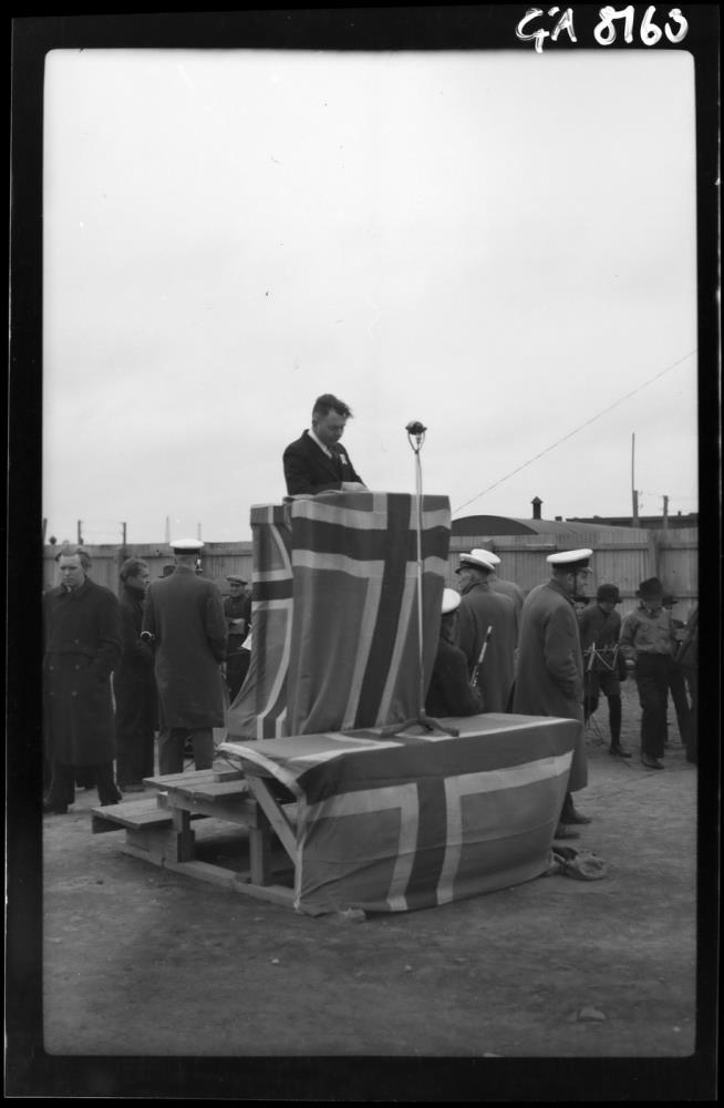 Í ræðstól fulltrúi útgerðarmanna Loftur Bjarnason. Félagar úr lúðrasveit Reykjavíkur til hægri. ( Skv. gjörðabók Sjómannadagsins 1937-1978, bls. 73). Maður í dökkum frakka, lengst til vinstri, er Pétur Pétursson útvarpsþulur.