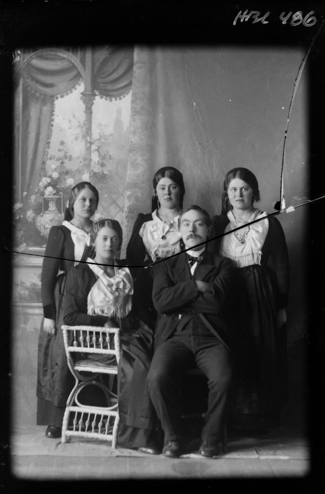 Hólmsbæjarsystur Guðjónsdætur, Eyrarbakka. Súsanna, Áslaug, Guðríður, Ingvar Jónsson, maður einnar þeirra, bókari og Ásta.