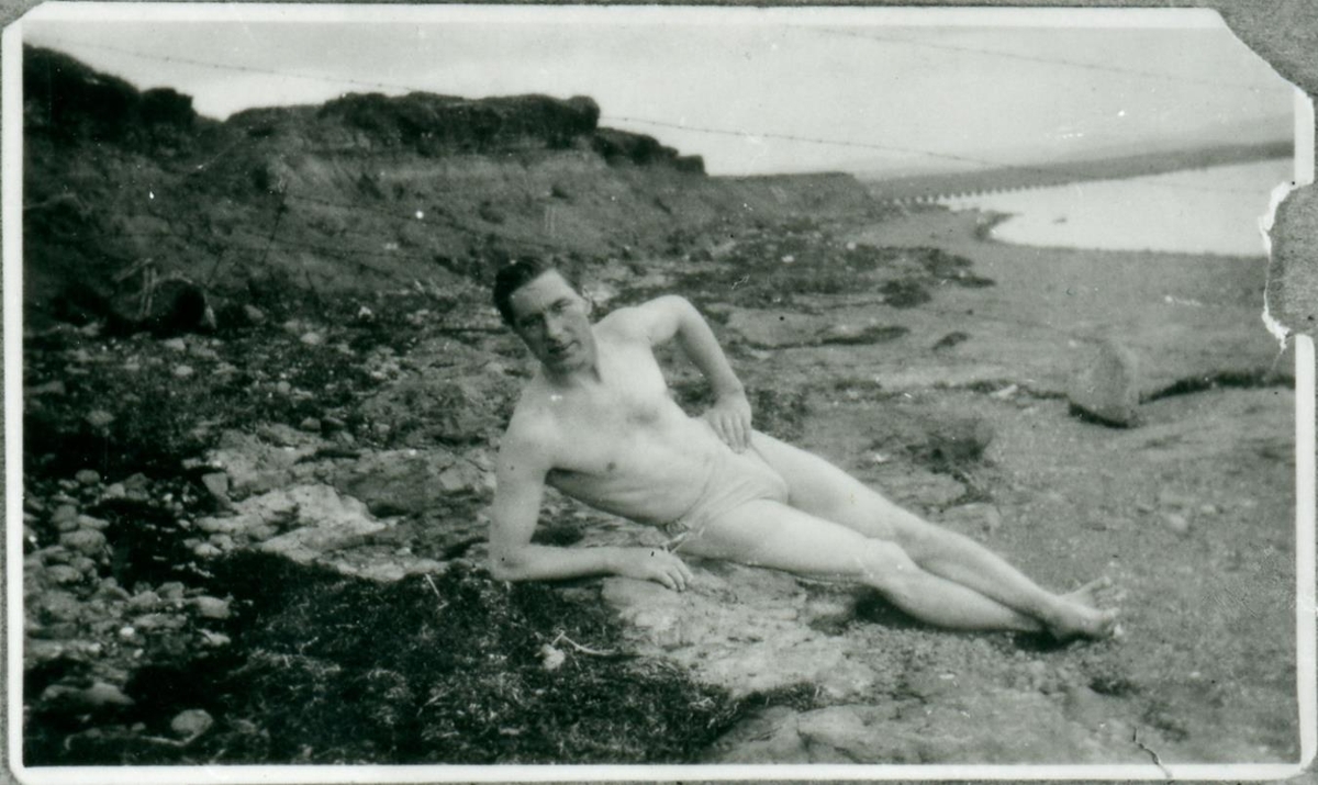 Í forgrunni er karlmaður á sundskýlu sem rís upp við dogg í flæðarmálinu fyrir ljósm. Í baksýn eru há moldarbörð að fjörunni.