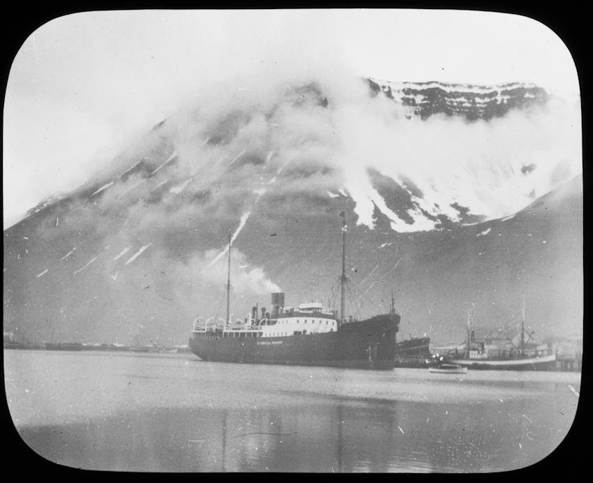 Ísafjörður. Stórt millilandaskip á legu. Vélbátur við bryggju í baksýn. Fjall. Naustahvilftin blasir við í baksýn. Um 1925-30.