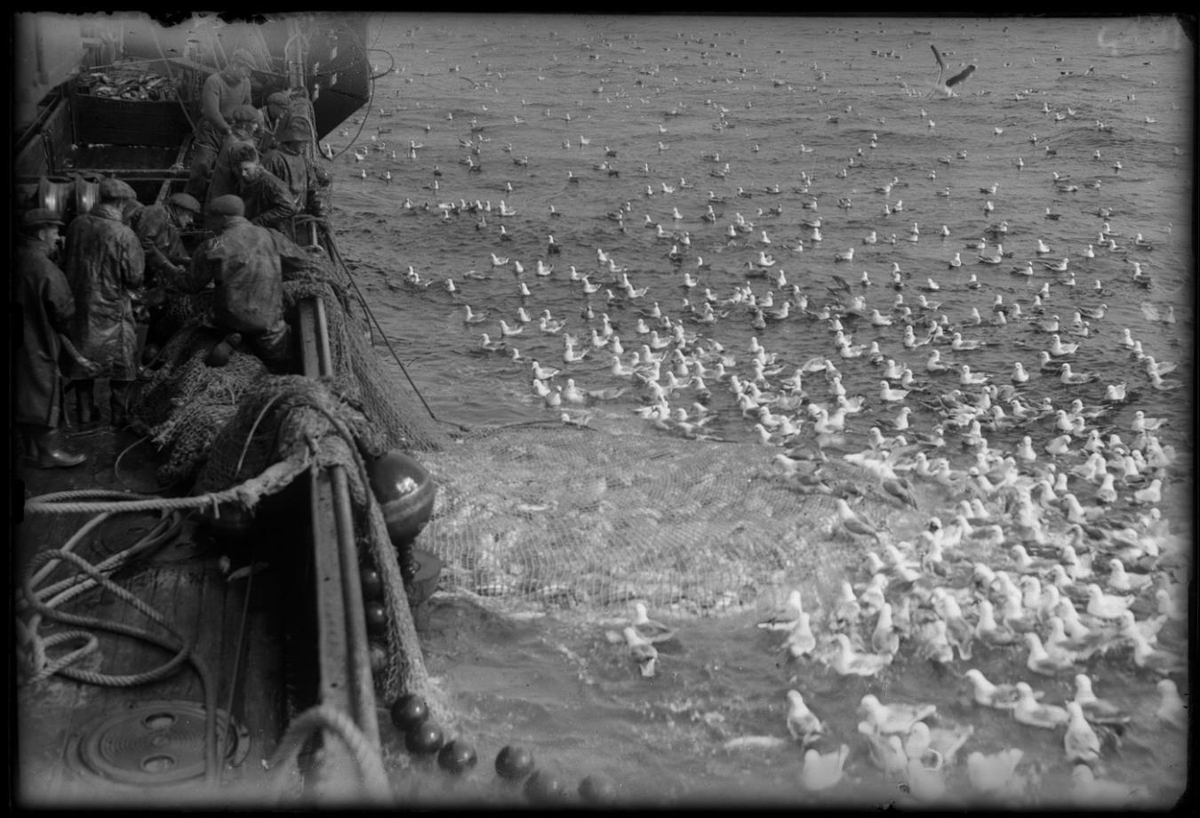 Um borð í togara. Sést niður á þilfar stjórnborðsmegin og flýtur trollið með fiski í við síðuna. Menn á þilfarinu, flestir klæddir sjótstakk og með húfur, einn með sjóhatt, annar á peysu. Fuglager.