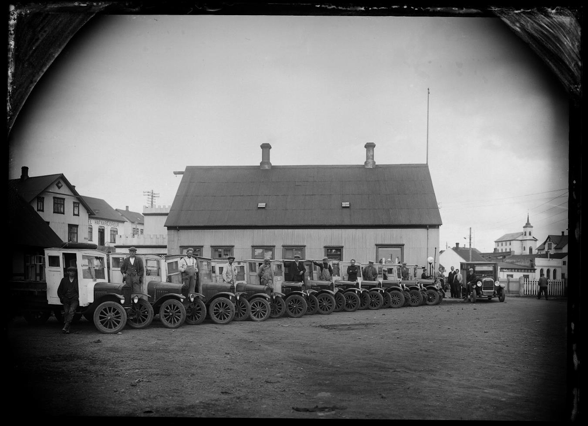 Röð vörubíla á plani við timburhús með háu risi. Menn standa við hús hvers
