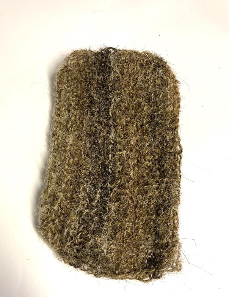 Hrosshársþvaga í brúnum lit. Prjónuð af Elínu Þorsteinsdóttur í Skógum árið 1965 að beiðni Þórðar, sem spann hrosshárið. 24 x 13,5 cm.