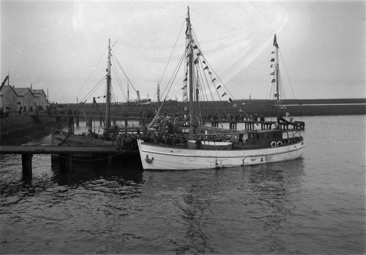 Bátar prýddir fánum liggja við bryggju. Á öðrum þeirra má lesa einkennisstafina NK 53, handan sjóvarnagarðsins er gufuskip á siglingu.