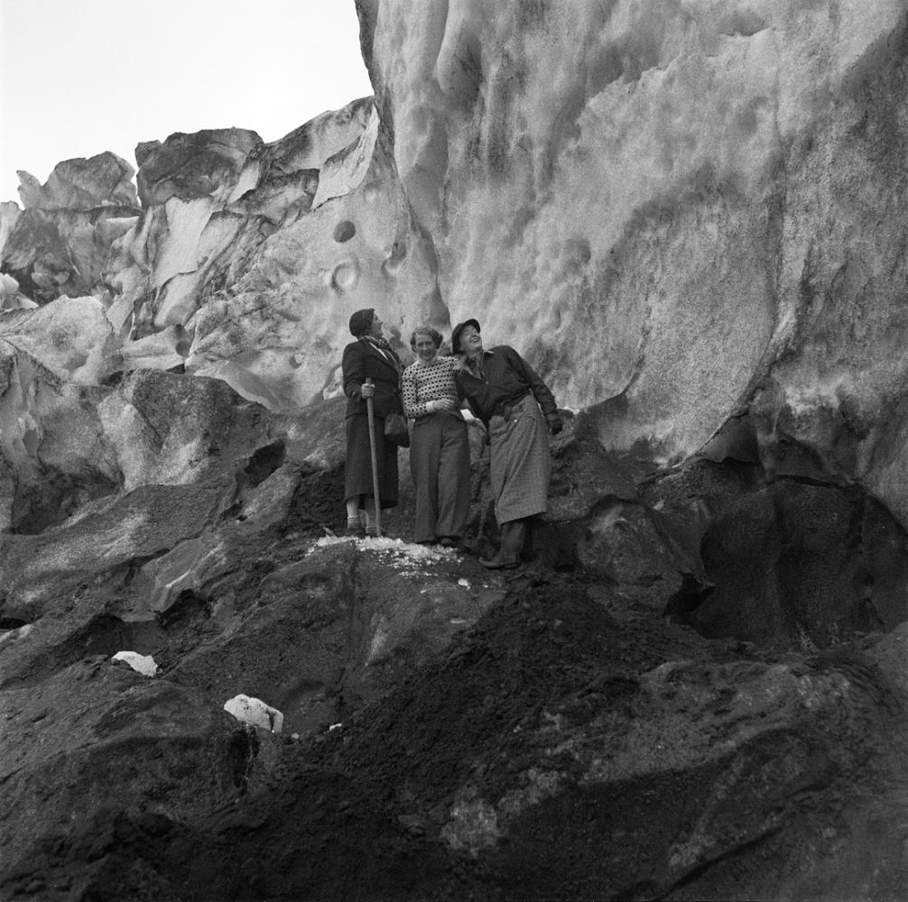Þrjár ferðaklæddar konur standa undir ísvegg líklega á skriðjökli. Ein