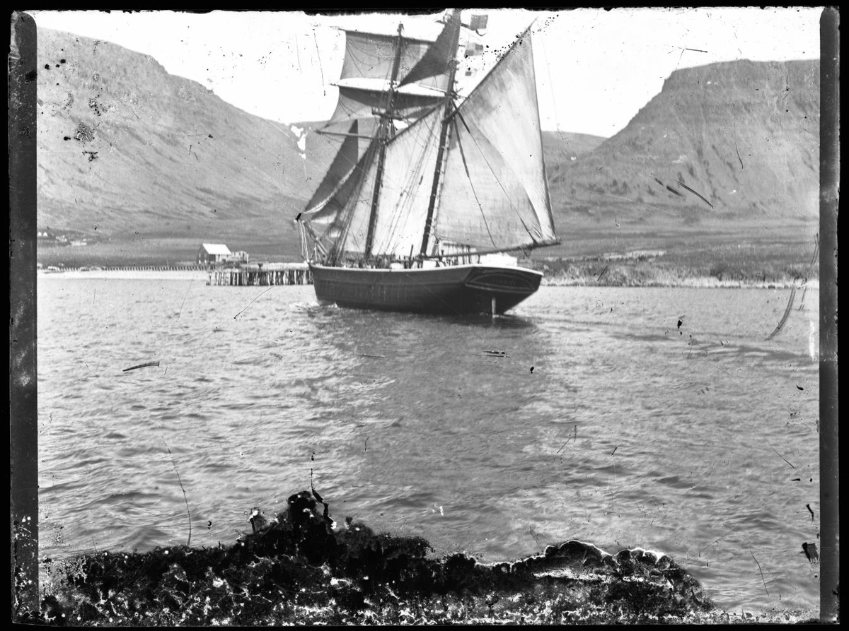 Skonnortan Guðrún á Þingeyri undir fullum seglum um 1900. Fjöll, bryggja og hús á Geirseyri í baksýn.