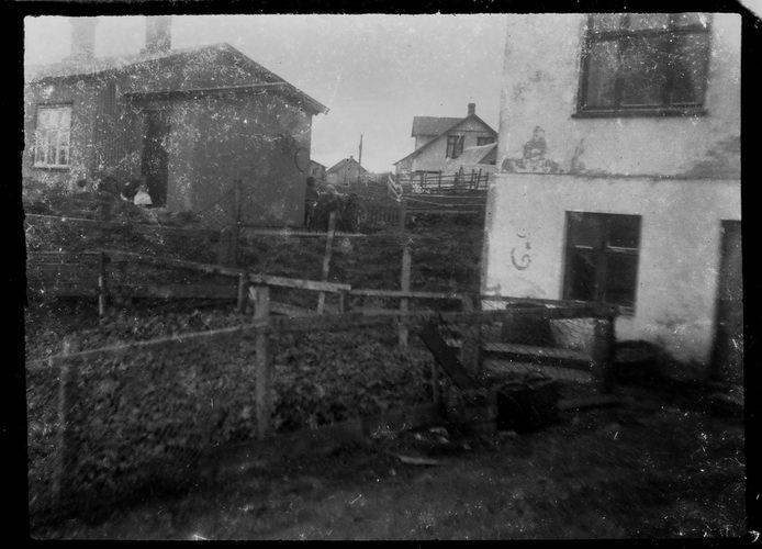 hlið þess er einlyft timburhús bárujárnsklætt. Á milli húsanna sér