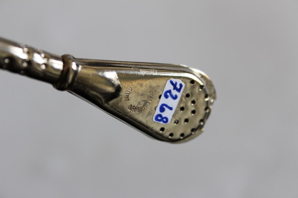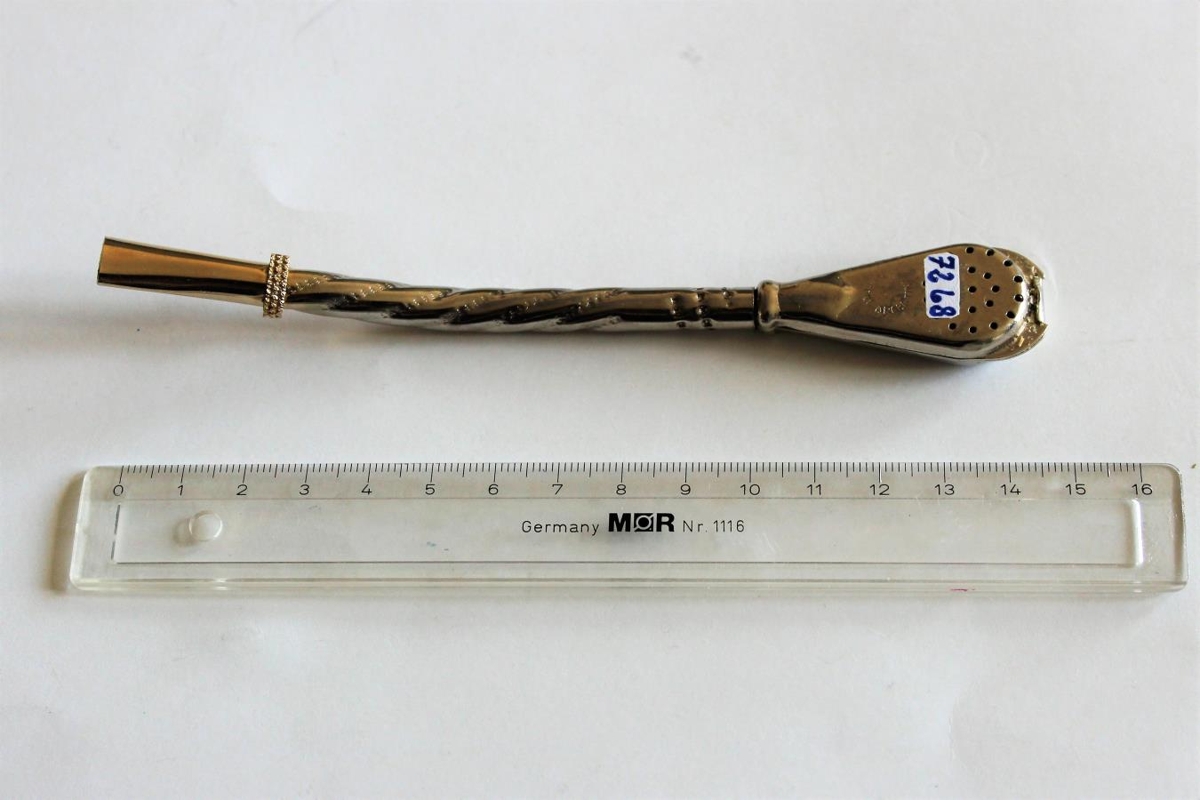 Tepípa frá Argentínu í Suður-Ameríku. Gatað hylki fyrir telauf á neðri enda, efri hlutinn sogpípa. Silfurlitur málmur. Ógreinilegt framleiðslumerki. Lengd 15 cm.