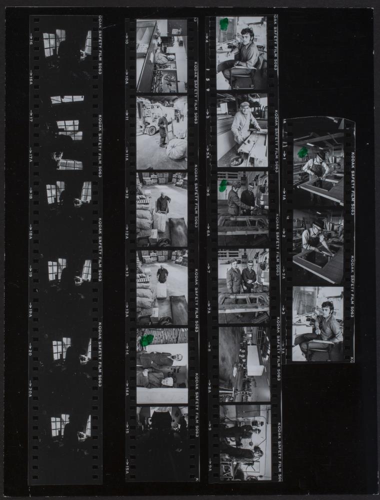 Kaupfélag Skaftfellinga, Vík. Snertiprent (e. contact) af 35mm filmu með myndum frá Kaupfélagi Skaftfellinga í Vík í Mýrdal. Sér í Willys jeppa sem ekki er eldri en 1970 árgerð. Einnig er verið að breyta GMC vörubíl í mjólkurbíl í bifreiðasmiðjunni.