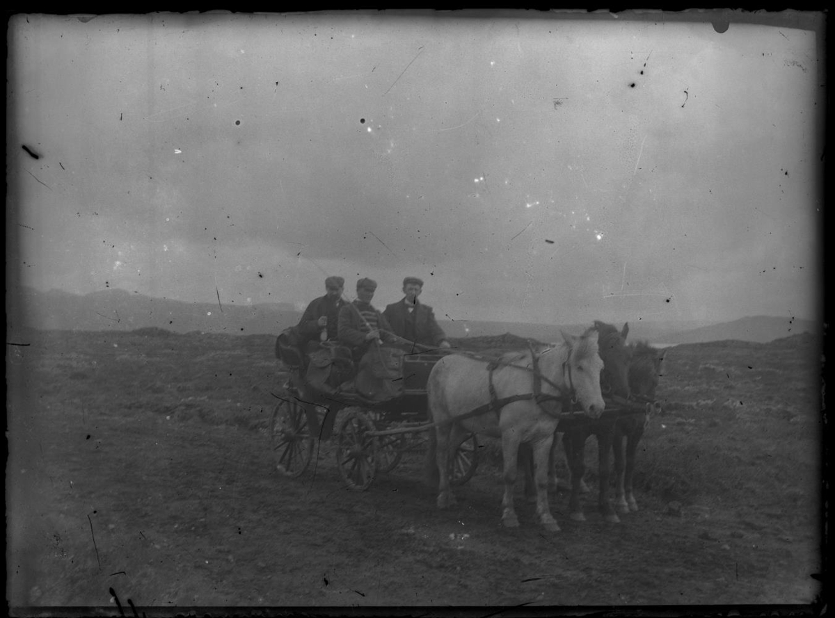 Þrír menn í hestakerru sem dregin er af þremur hestum.