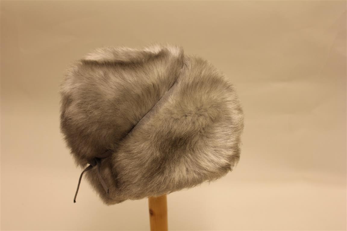 Kúlulaga og niður með eyrum er flipi. Utan um miðjuna er bundið grátt band. Litur: grár