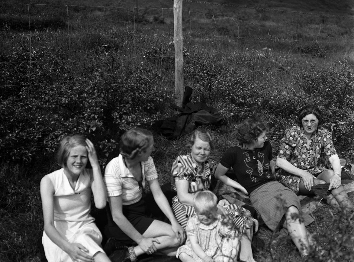 Fjórar konur með tvær stelpur sitja í kjarri. Guðrún Ólafsdóttir kona Björns