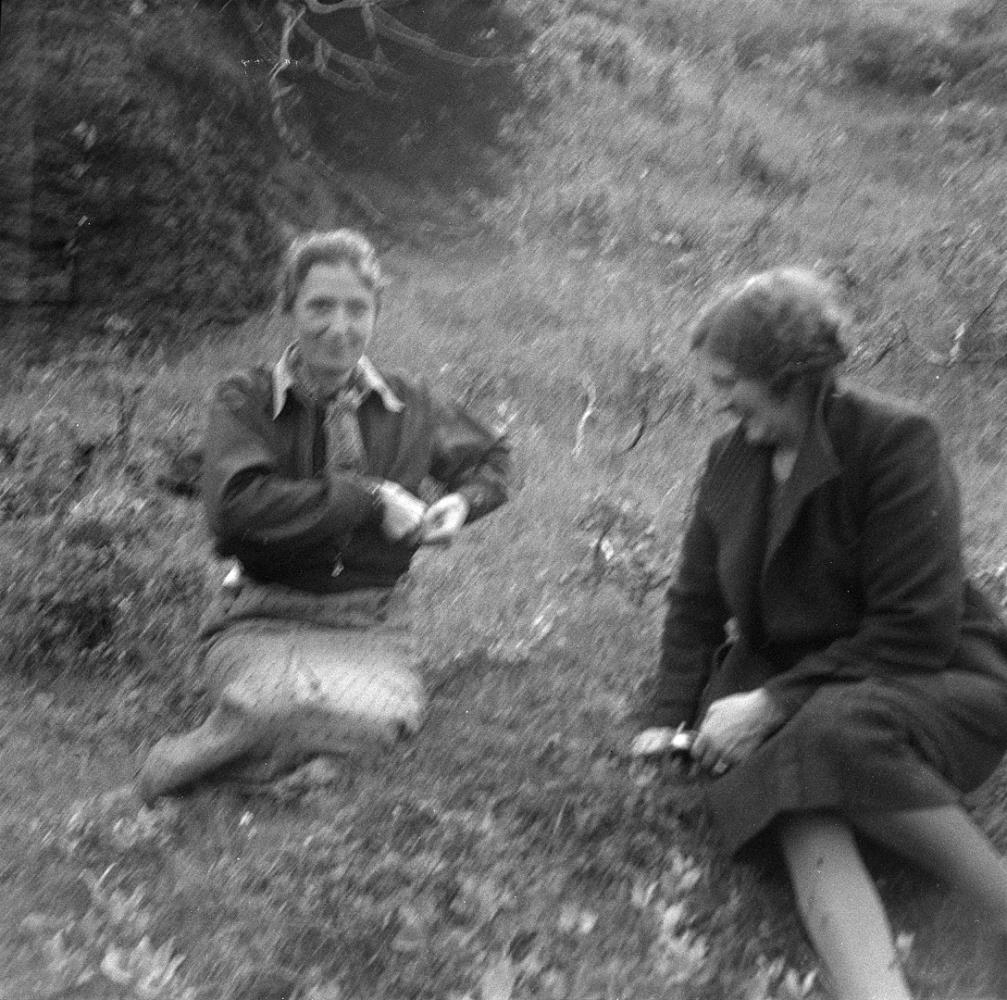 Tvær konur sitja í grasi í kjarri. Guðrún Ólafsdóttir kona Björns M. Arnórssonar