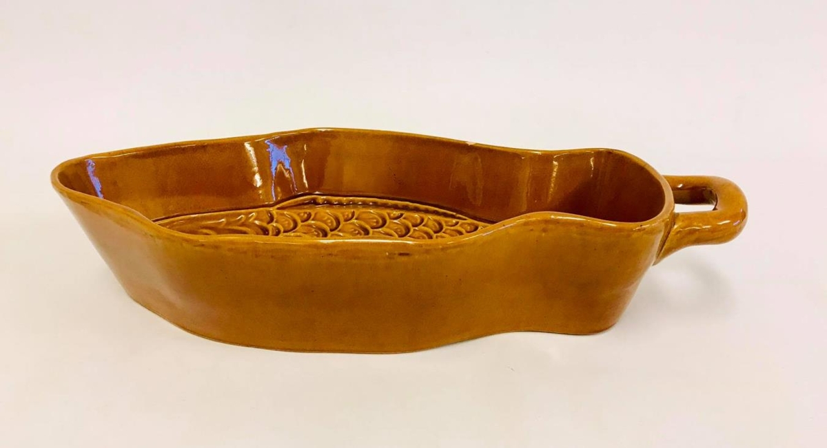 Brúnt eldfast mót, það er mótað eins og fiskur. Gripurinn er úr dánarbúi Maríu Pálsdóttur og Jón Árna Jónssonar (menntaskólakennara). Þau bjuggu lengst af í Þingvallarstræti 20. Þau voru bæði fædd á Akureyri. Börn þeirra hjóna voru Páll, Lovísa, Steingrímur, Jón Árni, Stefán og Þóra.