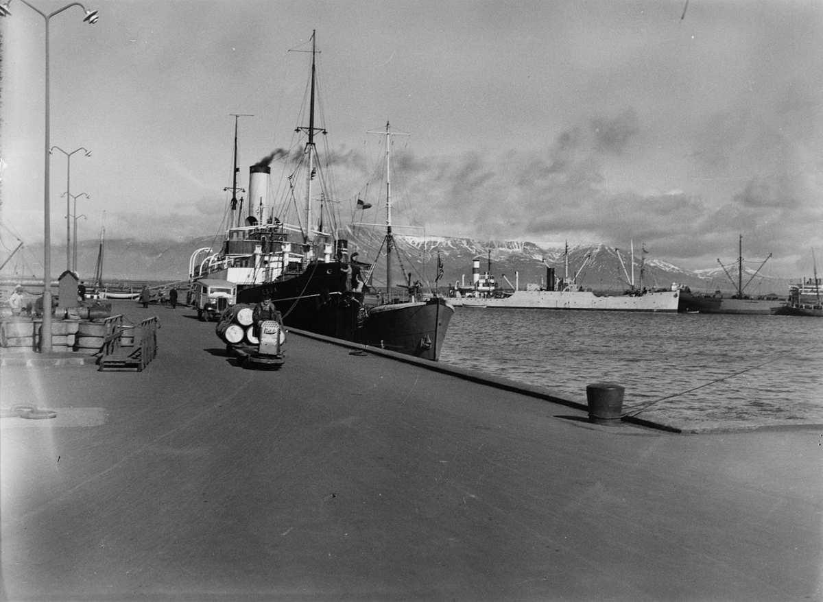 Reykjavíkurhöfn. Reykjavík. Strandferðaskip við bryggju og menn að vinna við mála eða þrífa stefni þess. Nafnið ESJA ámálað við borðstokk. Rúta við skipshlið, fólk á ferli, verið að keyra olíutunnur á litlum flutningabíl eða vagni, framan á honum stendur Lister. Utan á Esju liggur minna skip, sjá má fallbyssu í stefni þess. Menn að störfum á bryggjunni. Sér til fleiri skipa m.a. flutningaskips við bryggju fjær. Filma 9x12.