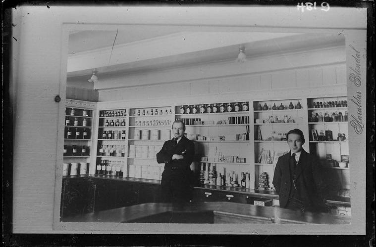 Apótekið - inni. „Kaj Carlo Petersen apótekari og Einar Kristjánsson lyfjasveinn.“ (ILB 2017)
