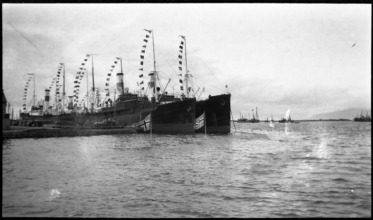Þrír togarar fánum skreyttir við bryggju. Rétt við bryggjuna hefur tveimur íslenskum fánum verið komið fyrir á stöngum í sjónum. Líklega til að mynda eins konar heiðurshlið fyrir danska konunginn.