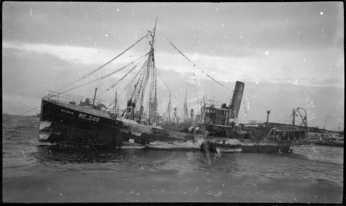 „Flest bendir til að þessi mynd hafi verið tekin af Hilmi um 10. febrúar 1925 þegar hann kom til hafnar eftir Halaveðrið. Brotsjóir höfðu meðal annars sópað bátunum af bátaþilfarinu.“ (BÞ 2016)