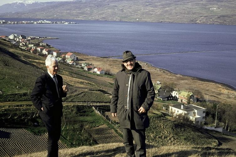 Jónas Kristjánsson og Hörður Ágústsson uppi á brekkunni við Akureyri.