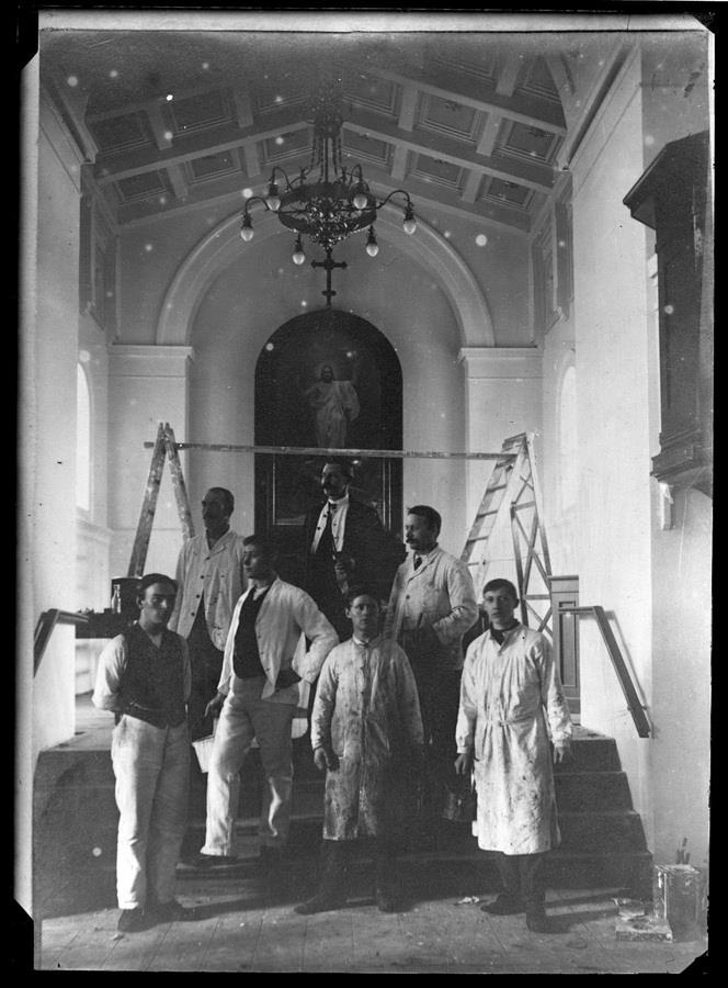 í vinnufötum með fötur og pensla uppstilltir í hóp við stiga við kór kirkju.