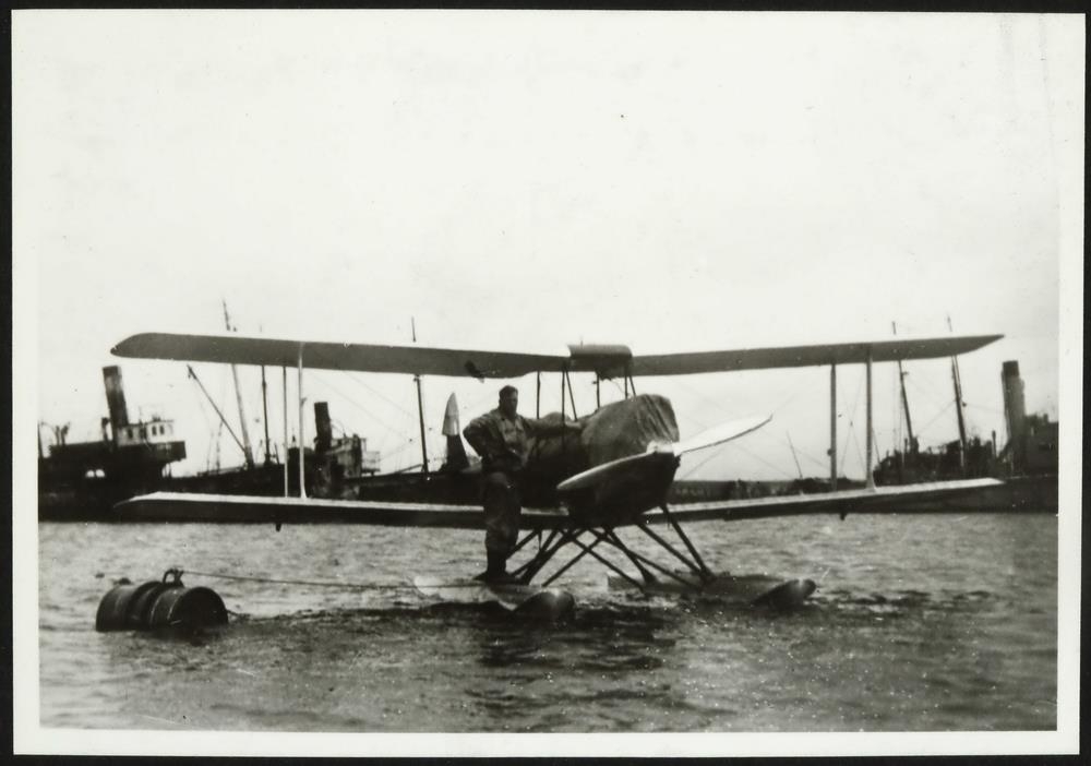 Eftirtaka. Í forgrunni er lítil einshreyfils sjóflugvél, tvíþekja, DH Gipsy Moth ROUGE et NOIR, sem liggur við stjóra í Reykjavíkurhöfn og er myndin tekin framaná vélina. Á öðru flotholtinu stendur karlmaður og styður sig við búk vélarinnar. Í bakgrunni sjást nokkrir togarar. Úr syrpu af myndum teknum í tengslum við ferðir John Grierson til Ameríku og Light frá Ameríku á árunum 1933 og 1934. Í meðf. skrá stendur: 'J.Grierson/DH Gipsy Moth ROUGE et NOIR Rvíkurhöfn. eftir 7.8.1933'.